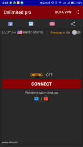 Unlimited Pro ini menggunakan basis Anonytun versi terbaru. Unlimited pro memiliki tampilan interface yang jauh berbeda dengan Anonytun original, karena temanya sudah dirubah menjadi tema dark / hitam dengan hiasan tombol berwarna merah. Untuk fitur dan kemampunya sama saja dengan Anonytun ori dari Play Store. Berikut ini adalah tampilan halaman depan dari Unlimited Pro terbaru.
